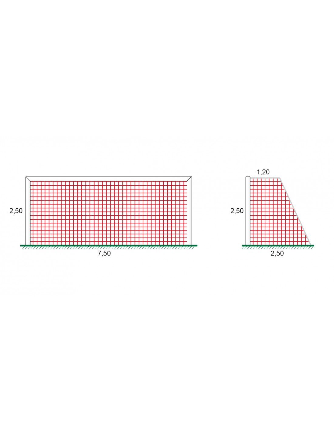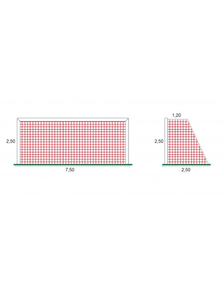 Juego de 2 redes para porterías de  fútbol 11 fabricadas con red de polipropileno de alta tenacidad, resistentes a rayos UV y alta resistencia a la tracción.Terminaciones de alta clalidad con triple cosido , cordón de refuerzo y cinta de proteción textil de 25mm. Red de 4mm de grosor malla 120. Medidas: 7,5m X 2,5m X 1,2m X 2,5m.