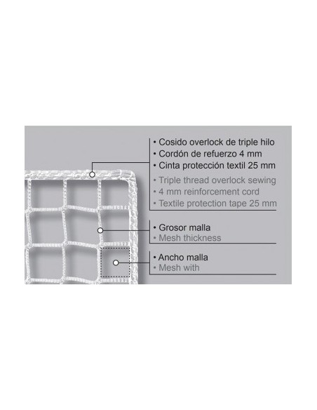 - Acabados: La red está reforzada por todo el perímetro con cuerda de 4mm, cinta de recubrimiento y cosido overlock de 3 hilos de 5000 deniers.