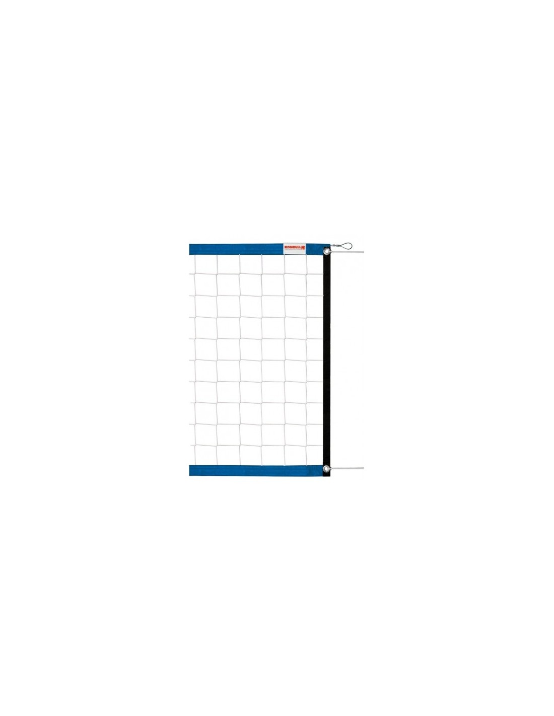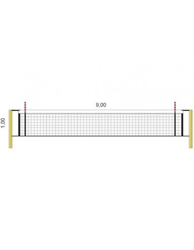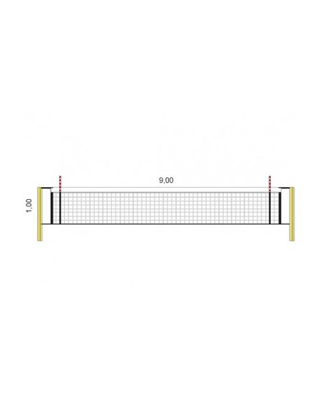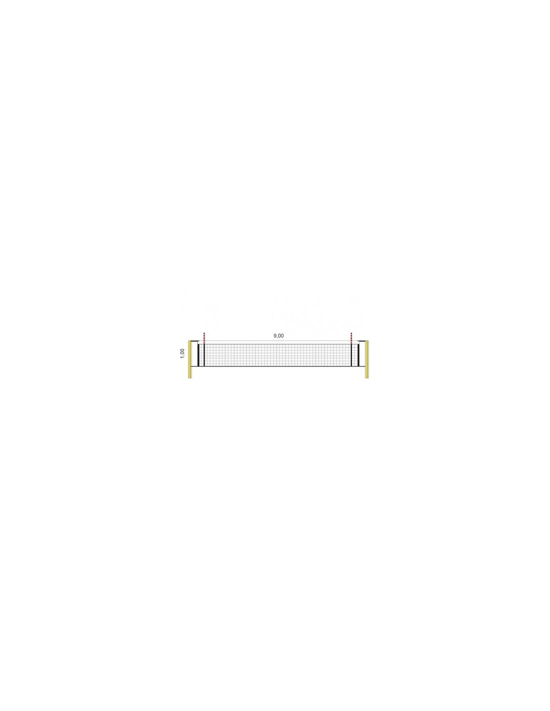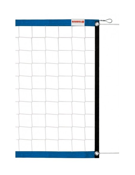 Red sin nudo de polipropileno alta tenacidad 3mm malla 100x100mm. Cinta azul de 5cm de ancho en parte superior y cable acero plastificado 3x5 pasado por su interior, cinta de poliéster negro en laterales. Cinta azul parte inferior. Cuerdas de tensión en laterales superior e inferior.