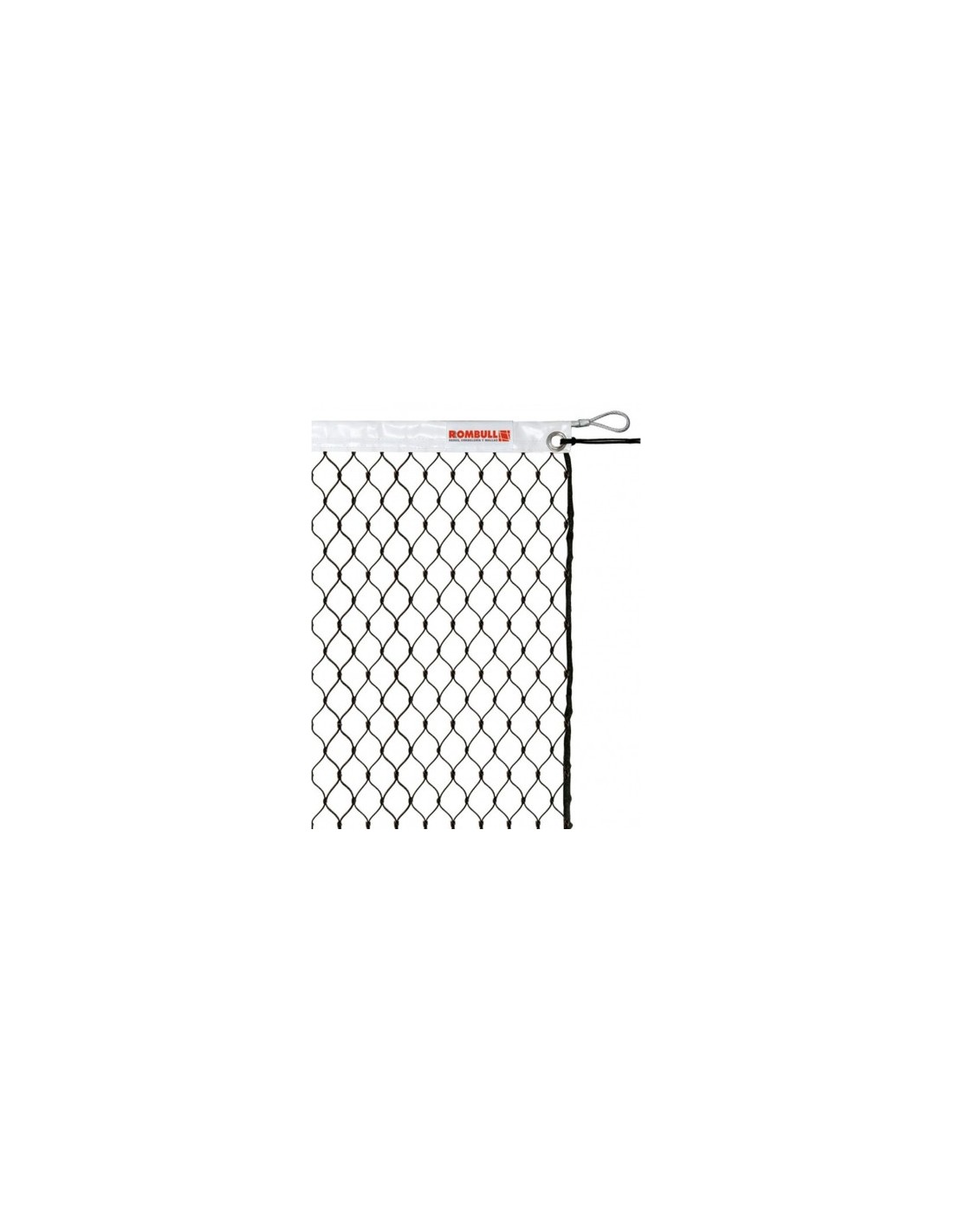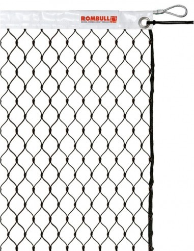 Confeccionada con hilo de polietileno cableado, red de 3mm de grosor, ancho de malla de 43mm. Banda superior de PVC blanco, ribete poliéster negro en los laterales, cuerda de pp de 3mm en la parte inferior pasada malla a malla. Un ollado en cada esquina superior de la red. Cuerda de tensión doble de 3mm. Cable de acero plastificado de 5mm.