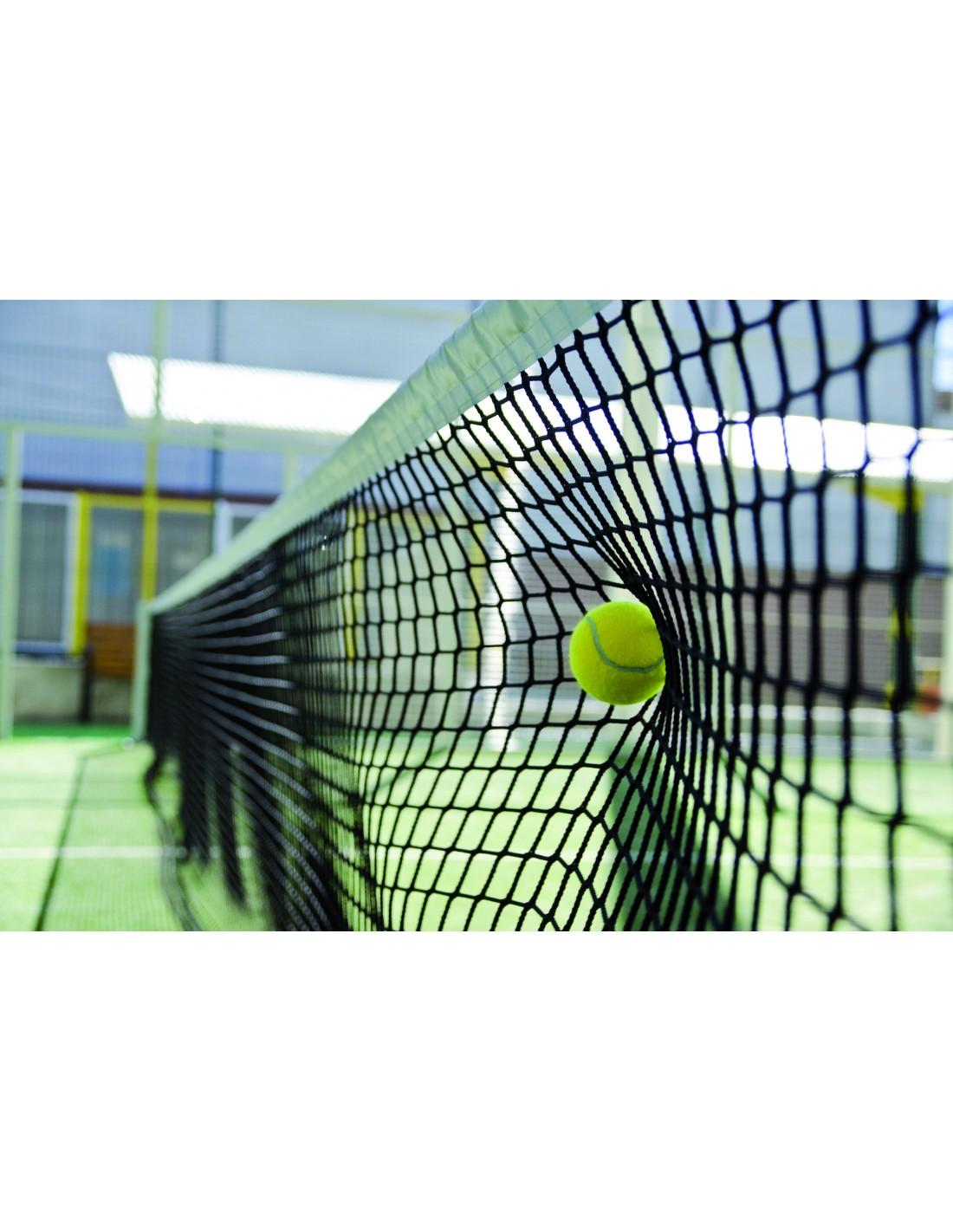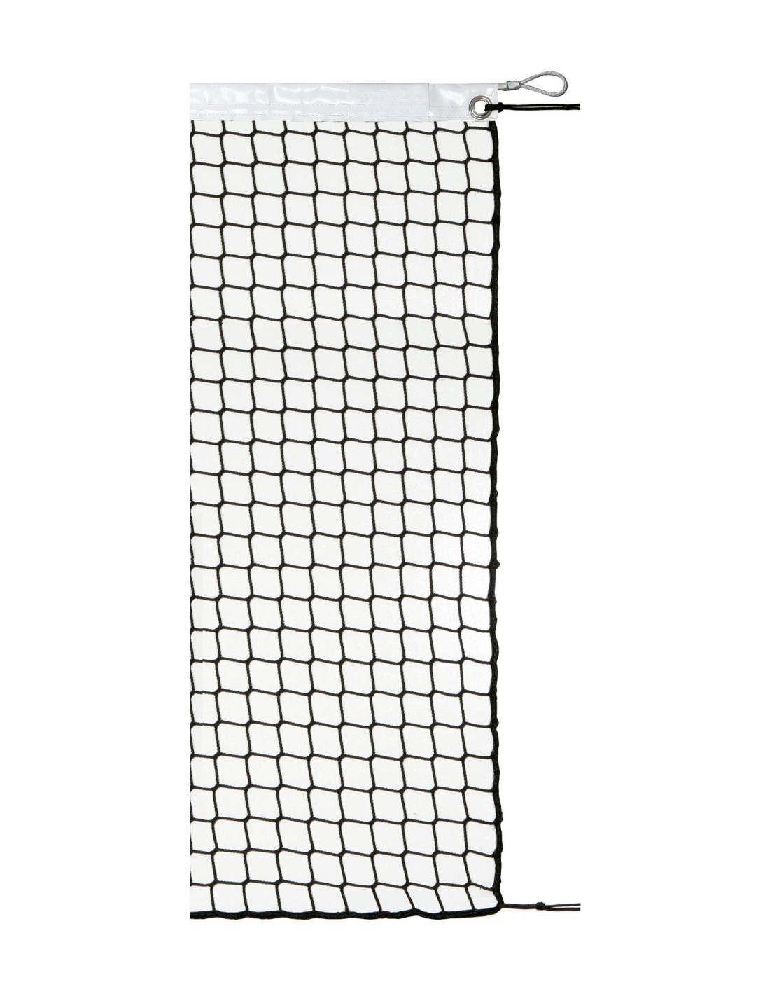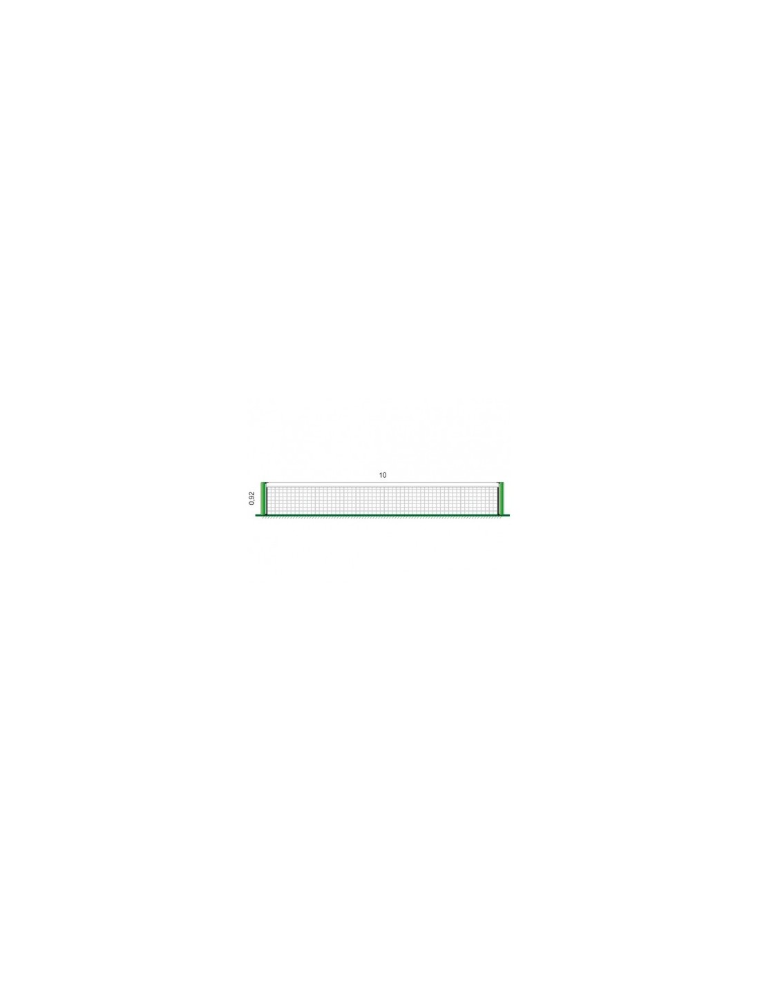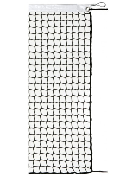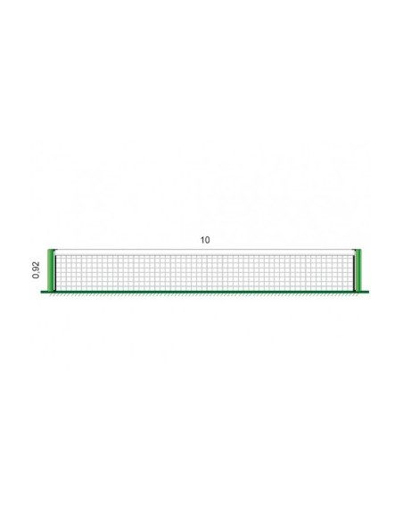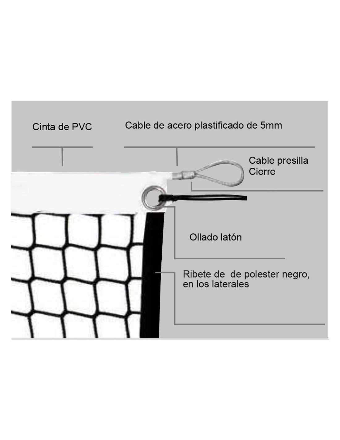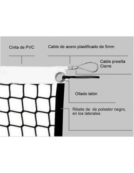 Red fabricada con polipropileno de alta tenacidad de 3mm de grosor y ancho de malla 43mm, banda superior confeccionada en PVC color blanco, ribetes en poliéster negro en los laterales e inferior de la red. Ollado en esquinas superiores de la red, incluidos cuerda de tensión doble de 3mm y cable de acero.