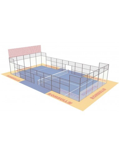 Red fabricada con polipropileno de alta tenacidad de 3mm de grosor y ancho de malla 43mm, banda superior confeccionada en PVC color blanco, ribetes en poliéster negro en los laterales e inferior de la red. Ollado en esquinas superiores de la red, incluidos cuerda de tensión doble de 3mm y cable de acero.