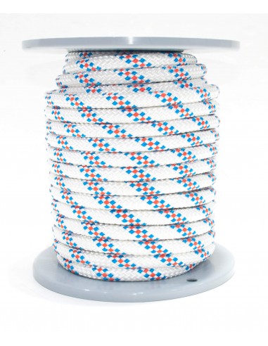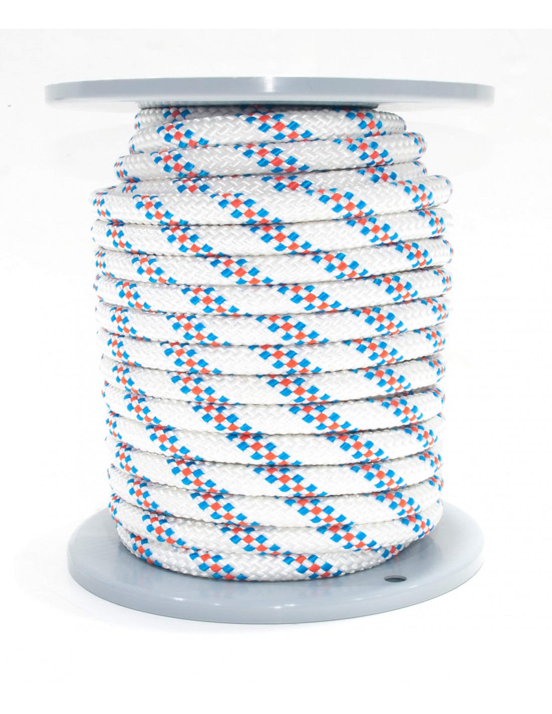 CUERDA POLIESTER CON ALMA 12MM 25M BLANCA PINTAS AZULES Y NARANJAS